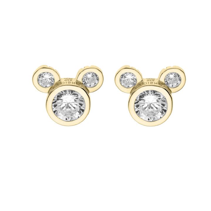 Pendientes Plata Dorada AG0136P Mickey Mouse Circonitas. Pendientes fabricados en plata dorada de ley 925. Diseño de Mickey Mouse con circonitas. Cierre presión. Certificado de autenticidad y garantía de calidad en los materiales de fabricación. Ref AG0136P