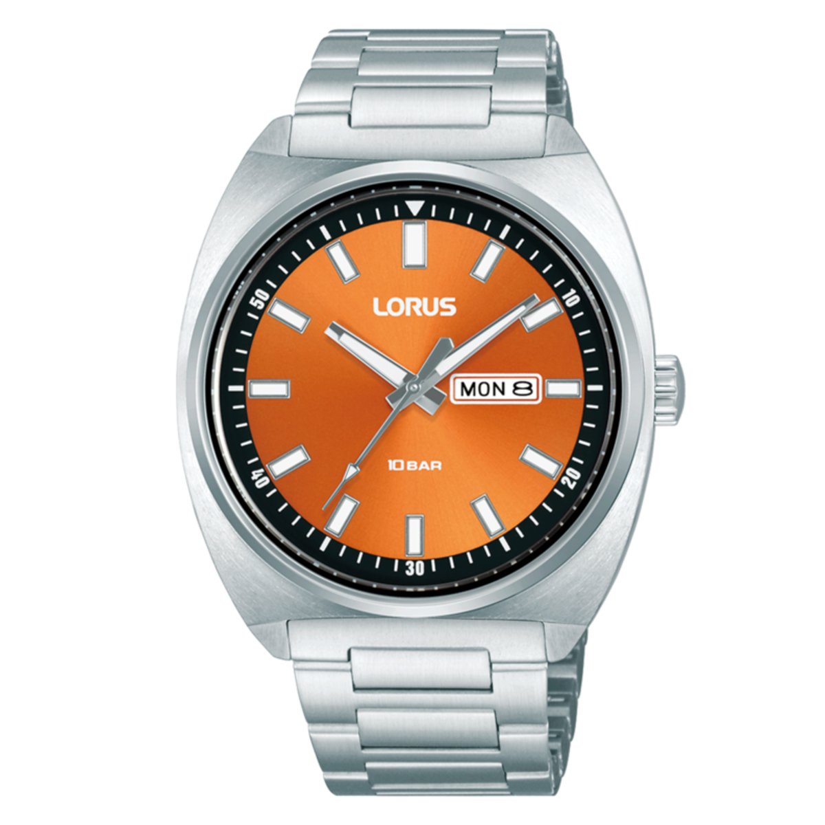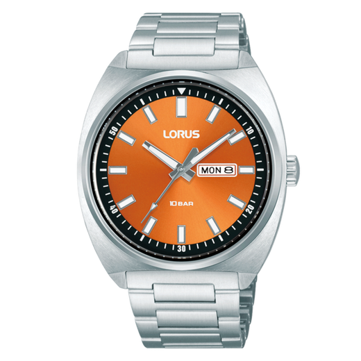 Reloj Lorus Hombre RH315BX9S Acero Analógico. Caja de acero de 41mm de diámetro. Bisel plateado. Brazalete de acero inoxidable. Cierre desplegable. Esfera naranja bicolor negra. Multifunción, calendario. Cristal mineral. Movimiento quartz. Sumergible 100m. 3 años de garantía. Ref RH315BX9S