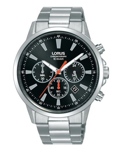 Reloj Lorus Hombre RT309LX9 Cronógrafo Acero Analógico. Caja de acero de 43mm de diámetro. Bisel plateado. Brazalete de acero inoxidable. Cierre desplegable. Esfera negra. Multifunción, cronógrafo y calendario. Cristal mineral. Movimiento quartz. Sumergible 100m. 3 años de garantía. Ref RT309LX9