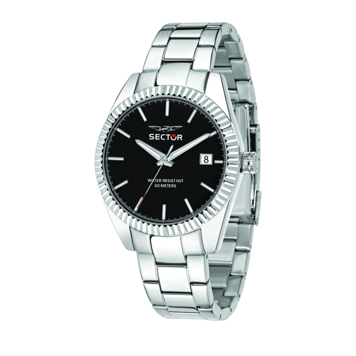 Reloj Sector Hombre R3253240011 Acero Analógico. Caja de acero de 41mm de diámetro. Bisel plateado. Brazalete de acero. Cierre desplegable. Esfera negra. Multifunción, calendario. Cristal mineral. Movimiento quartz. Sumergible 50m. 3 años de garantía. Ref R3253240011